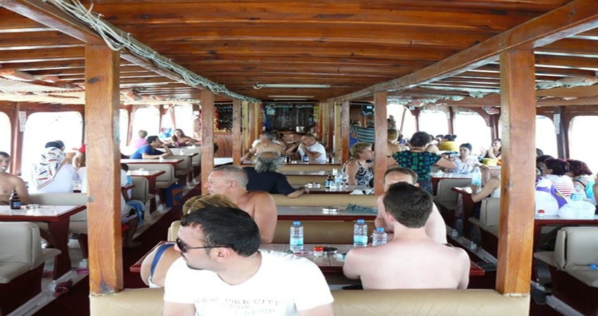 Tur sırasında öğle yemeği teknede servis edilmektedir. Menüde tavuk, mevsim salata ve soslu makarna yer alır.